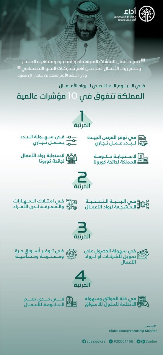 ويأتي ذلك التميز إثر الجهود المثمرة والمحفزات الكبيرة والتسهيلات المختلفة، التي قدمتها القيادة الرشيدة لدعم رواد الأعمال، وفق رؤية المملكة 2030 بقيادة صاحب السمو الملكي الأمير محمد بن سلمان بن عبدالعزيز ولي العهد نائب رئيس مجلس الوزراء وزير الدفاع -حفظه الله- الذي يولي اهتماماً خاصاً بدعم شباب وشابات المملكة من رواد الأعمال؛ ليكونوا عنصراً في بناء مستقبل وطنهم.