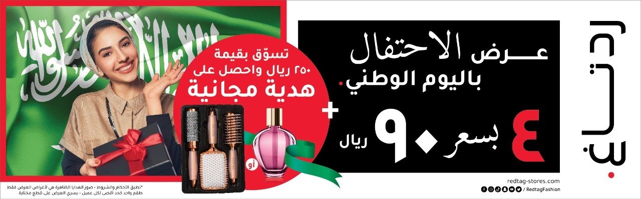 كشفت رد تاغ، العلامة الرائدة في المنطقة والمتخصصة بالمنتجات المنزلية والأزياء العصرية، عن إطلاق عرض خاص بعملائها في المملكة العربية السعودية بمناسبة اليوم الوطني السعودي الـ91 في 23 سبتمبر 2021. ويتيح عرض الاحتفال باليوم الوطني أمام العملاء فرصة شراء 4 قطع مقابل 90 ريال سعودي، بالإضافة إلى هديةٍ مجانيةٍ من عطرٍ فاخرٍ أو مجموعة منتجات عالية الجودة للعناية بالشعر عند الشراء بقيمة 250 ريال سعودي أو أكثر. ويستمر العرض من 12 وحتى 25 سبتمبر الجاري في السعودية، وهو متاح عند الشراء من متاجر العلامة أو عن طريق الإنترنت.
