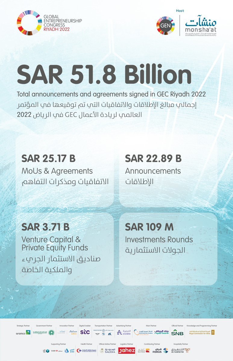 وحقق المؤتمر على مدى 4 أيام؛ رقمًا قياسيًا في قيمة مبالغ الاتفاقيات والإطلاقات والجولات الاستثمارية، بلغ أكثر من 51.8 مليار ريال (ما يعادل 13.8 مليار دولار أمريكي)، بهدف دعم ريادة الأعمال في مختلف المجالات، وتعزيز مكانة المملكة كبيئة جاذبة للرواد والمبتكرين والمبدعين من أنحاء العالم.