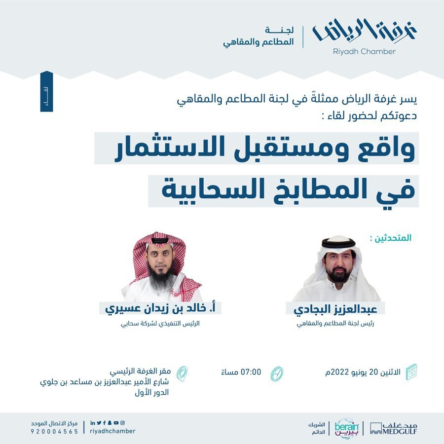 تنظّم غرفة الرياض ممثلةً بلجنة المطاعم والمقاهي لقاء بعنوان: «واقع ومستقبل الاستثمار في المطابخ السحابية»، وذلك مساء يوم الاثنين 20 يونيو 2022م الساعة 7:00م في مقر الغرفة.