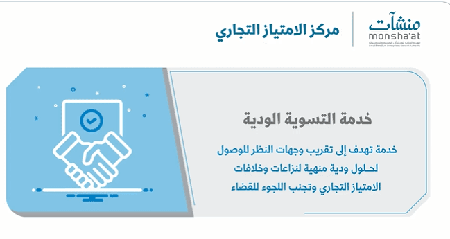 أطلق مركز الامتياز التجاري التابع لـ" منشآت" وبالمشاركة مع وزارة العدل خدمة التسوية الودية للنزاعات الناشئة بين طرفي اتفاقيات الامتياز التجاري لتسويتها بشكل ودي وضمان سرعة الإجراء.