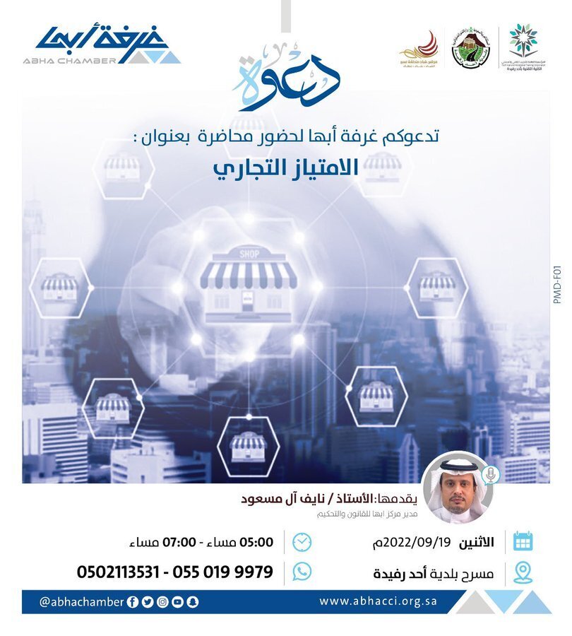 ويقدم المحاضرة الأستاذ نايف أل مسعود مدير مركز أبها للقانون والتحكيم وستكون بعنوان "الامتياز التجاري" وسيكون موعدها اليوم الاثنين 19سبتمبر بين الساعة 5-7 مساء وذلك في مقر مسرح بلدية أحد رفيدة.