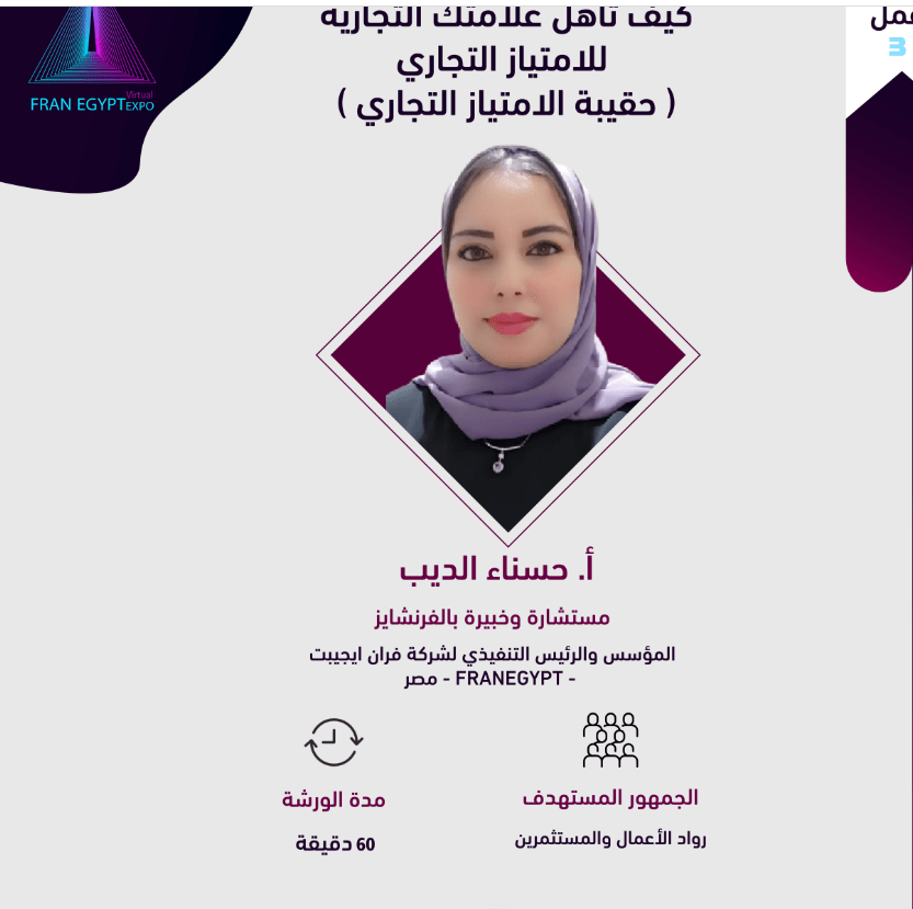 وأقيمت ورشة العمل المتخصصة الثالثة بعنوان (كيف تؤهل علامتك التجارية للامتياز التجاري “حقيبة الامتياز التجاري)وتحدثت فيها الأستاذة حسناء الديب – الرئيس التنفيذي لشركة FRANEGYPT .