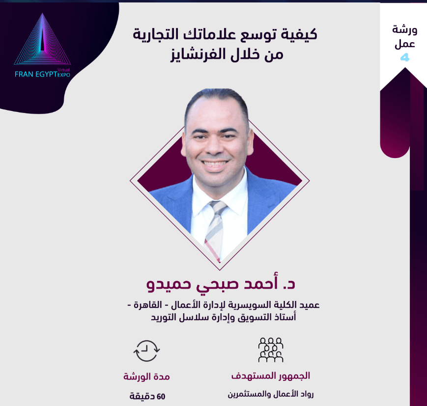 وأما الورشة الرابعة فكانت بعنوان ( كيفية توسع علاماتك التجارية من خلال الفرنشايز) وتحدث فيها الدكتور أحمد صبحي حميدو – عميد الكلية السويسرية لإدارة الأعمال – مصر.