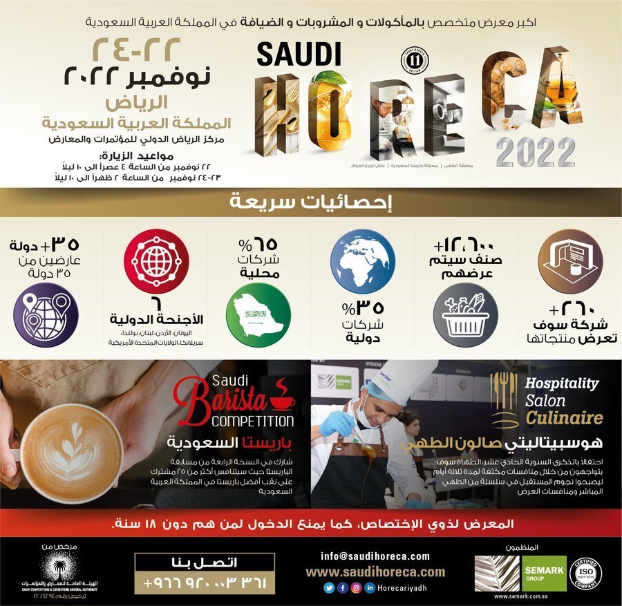 برعاية رئيس اتحاد الغرف السعودية ورئيس مجلس إدارة الغرفة التجارية بالرياض الأستاذ عجلان بن عبدالعزيز العجلان يفتتح اليوم الثلاثاء المعرض الدولي للمأكولات والمشروبات والضيافة (هوريكا 2022) والذي يقام في العاصمة الرياض بمركز الرياض الدولي للمؤتمرات والمعارض، وذلك خلال الفترة (22-24 نوفمبر)، ويشهد المعرض هذا العام مشاركة عدد كبير من الشركات المحلية والدولية ، ويقام خلال المعرض عدد من الفعاليات مثل صالون كولينير الذي يتم من خلاله التنافس بين الطهاة في مسابقة يشرف عليها لجنة تحكيم دولية، كما تقام مسابقة الباريستا والتي يتنافس خلالها صناع القهوة على الفوز بمراكزها الأولى ويشرف عليهم لجنة تحكيم مكونة من عدد من الخبراء، كما يقام عدد من ورش العمل في المجال، ويقام معرض هوريكا للعام الحادي عشر في السعودية وحقق خلال النسخ الماضية نجاحات واسعة إذ عقدت تحت سقفه صفقات كبيرة وصلت قيمتها لمليارات الريالات، ويعد المعرض هو الأكبر من نوعه في الخليج ويعتبر فرصة حقيقية لرواد الأعمال وأهل الاختصاص في الاطلاع على آخر ما توصل له المجال من تقنيات ونكهات وأدوات جديدة، كما تتوفر في المعرض فرص جديدة للراغبين في الحصول على حقوق (الفرنشايز) لعدد من الأنشطة في المجال . ويفتح المعرض أبوابه عند الساعة الرابعة عصراً لليوم الأول الى الساعة العاشرة مساء واليوم الثاني والثالث عند الساعة الثانية ظهراً وحتى العاشرة مساء، ويسمح بالدخول لأصحاب الاختصاص ويمنع دخول ممن هم دون 18 عاماً.