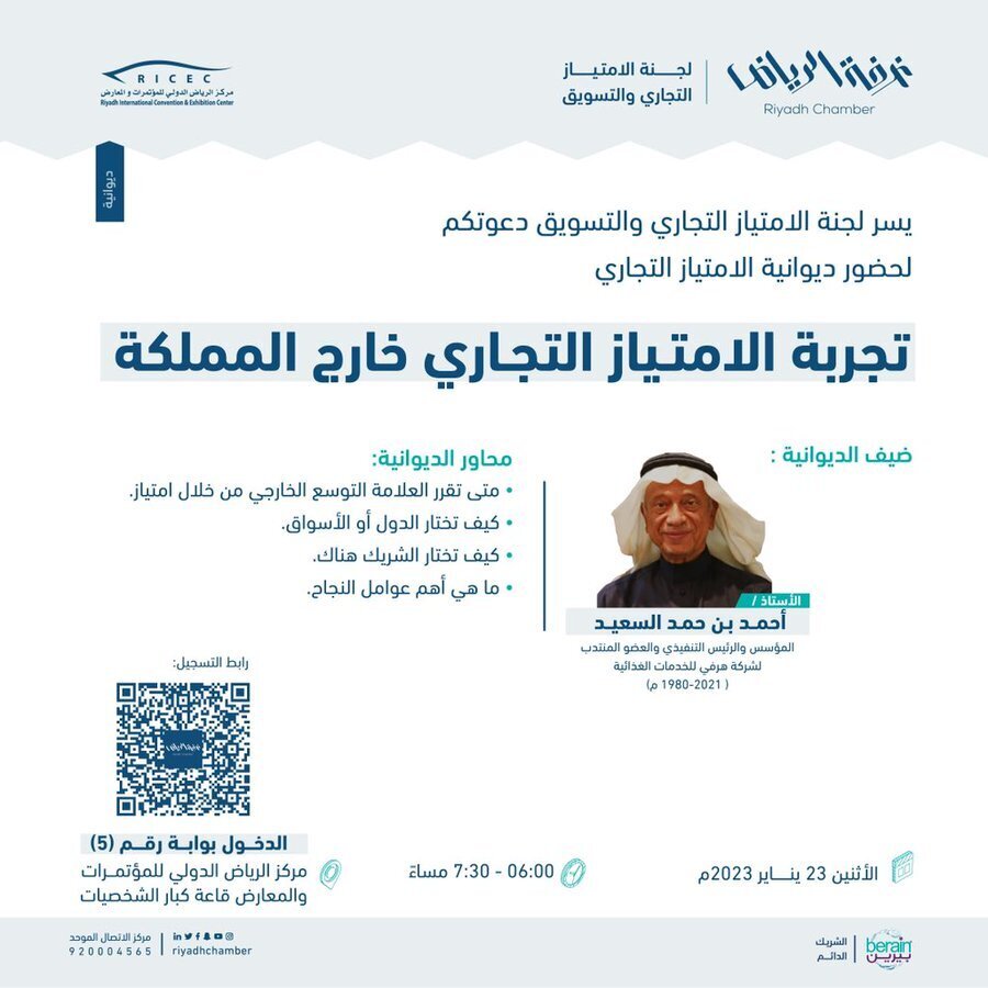 دعت لجنة الامتياز التجاري والتسويق في غرفة الرياض لحضور ديوانية الامتياز التجاري بعنوان تجربة الامتياز التجاري خارج المملكة وذلك يوم الاثنين القادم 23 يناير .