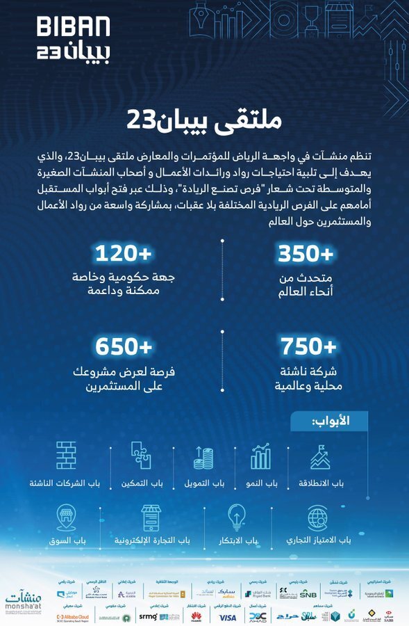 يفتتح اليوم الخميس (9 مارس) ملتقى "بيبان 23" الذي تنظمه الهيئة العامة للمنشآت الصغيرة والمتوسطة "منشآت" ، في واجهة الرياض للمعارض والمؤتمرات، والذي يستمر حتى 13 مارس، تحت شعار "فرص تصنع الريادة"؛ بمشاركة أكثر من 350 متحدثاً محلياً وعالمياً، و750 عارضاً من رواد الأعمال المحليين والعالميين، بحضور عدد من أصحاب المعالي، ورواد الأعمال، والمستثمرين، وصناع القرار.