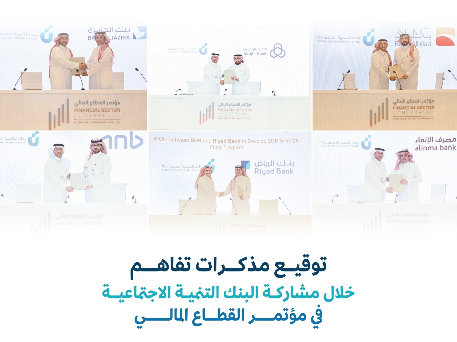 وقع بنك التنمية الاجتماعية عدة مذكرات تفاهم مع عدد من البنوك التجارية الشريكة للتعاون في تطوير برنامج الصندوق الادخاري، حيث وقع مع بنك الرياض، ومصرف الراجحي، ومصرف الإنماء، والبنك العربي الوطني، وبنك البلاد، وكذلك بنك الجزيرة، وذلك بحضور الرئيس التنفيذي للبنك الأستاذ إبراهيم بن حمد الراشد، سعياً لتحقيق التمكين التنموي الشامل والمستدام، ويأتي ذلك خلال مشاركة البنك في مؤتمر القطاع المالي الذي تنعقد أعماله يومي 15 و16 من شهر مارس الجاري، في مركز الملك عبد العزيز الدولي للمؤتمرات بمدينة الرياض.