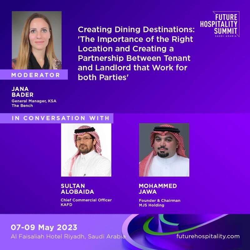 وستتولى جنى بدر، المديرة العامة لشركة ذا بنش إدارة جلسة مهمة في قمة الضيافة يشارك فيها سلطان العتيبي الرئيس التنفيذي للشؤون التجارية في مركز الملك عبد الله المالي (كافد) ، ومحمد جاوا المؤسس ورئيس مجلس الإدارة في MJS Holding.وستركز الجلسة على إنشاء وجهات طعام ناجحة في المملكة العربية السعودية، والعلاقة بين الموقع والمالك والمستأجر، حيث يتطلب انشاء وجهة طعام مزدهرة عدد لا يحصى من العوامل ، ولا شيء يحمل أهمية أكبر من العناصر الرئيسية للموقع والشراكة. في حين أن البحث عن الموقع المثالي أمر بالغ الأهمية، فإن إقامة علاقة بناءة وتكافلية بين المستأجر والمالك أمر لا غنى عنه بنفس القدر.