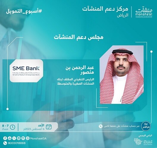 ويستضيف أسبوع التمويل مجموعة من أبرز الخبراء المعنيين بمجال تمويل قطاع المنشآت الصغيرة والمتوسطة، من بينهم الرئيس التنفيذي المكلف لبنك المنشآت الصغيرة والمتوسطة عبد الرحمن بن منصور، الذي سيقدم جلسة للتعريف بمنتجات البنك والإجابة عن كافة استفسارات المستفيدين، إلى جانب استضافة مجموعة من البنوك السعودية لتسليط الضوء على أهم منتجاتها التمويلية المخصصة لرواد الأعمال وأصحاب المنشآت الصغيرة والمتوسطة.