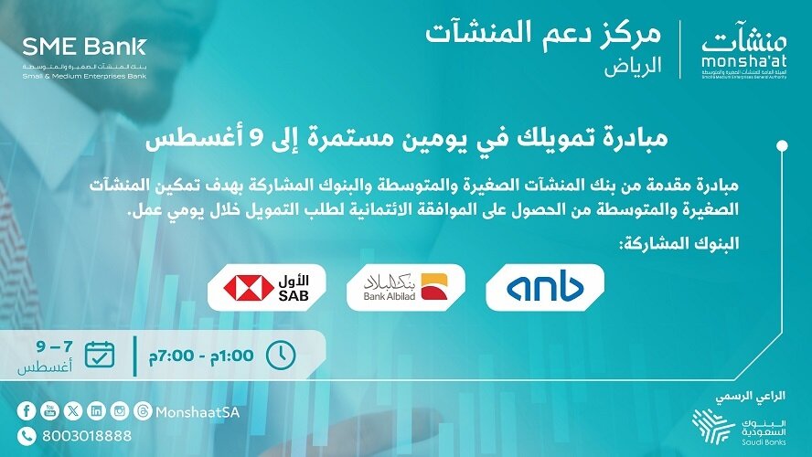 كما شهد أسبوع التمويل، إطلاق مبادرة "تمويلك في يومين" من قبل بنك المنشآت الصغيرة والمتوسطة، بالشراكة مع عدد من الجهات التمويلية، منها: بنك البلاد، البنك العربي الوطني، والبنك الأول؛ بهدف تسريع إجراءات الموافقة على طلبات التمويل، والحصول على الموافقة الائتمانية، وتعريف المنشآت وزوّار المراكز بمنتجات البنك التمويلية المتنوعة، وبرامج التمويل المشترك.