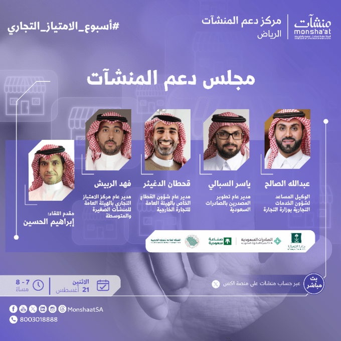 - ويستضيف أسبوع الامتياز التجاري مجموعة من أبرز الخبراء عبر مجالس دعم المنشآت، من بينهم الوكيل المساعد لشؤون الخدمات التجارية بوزارة التجارة عبدالله الصالح، ونائب رئيس بنك التنمية الاجتماعية لقطاع للأعمال سلطان الحميدي، ومدير عام تطوير المصدرين بهيئة تنمية الصادرات السعودية ياسر السبالي، بالإضافة إلى المدير العام لمركز الامتياز التجاري في "منشآت" فهد الربيش، للحديث عن البرامج والمبادرات التي تساهم في تنمية بيئة ريادة الأعمال.