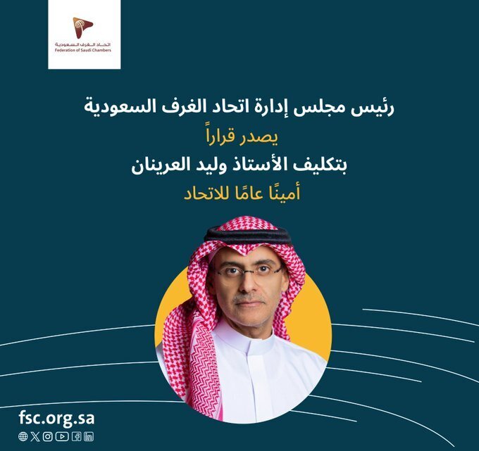 قرَّر مجلس إدارة اتحاد الغرف السعودية برئاسة حسن بن معجب الحويزي في اجتماعه الـ 125 المنعقد بالرياض، تكليف وليد بن حمد العريان،أمينًا عامًا للاتحاد.