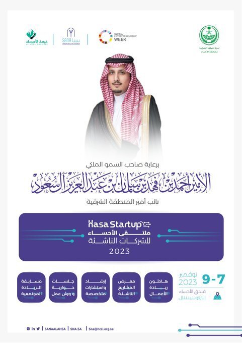 برعاية كريمة من صاحب السمو الملكي الأمير أحمد بن فهد بن سلمان بن عبدالعزيز، نائب أمير المنطقة الشرقية، تُنظّم غرفة الأحساء ممثلة بمركز الأمير أحمد بن فهد بن سلمان لتطوير الأعمال “سنا” ومجلس ريادة الأعمال “ملتقى الأحساء للشركات الناشئة 2023″، في دورته الثالثة، بالتزامن مع الأسبوع العالمي لريادة الأعمال، خلال الفترة من 23 إلى 25/04/1445هـ الموافق 07 إلى 09/11/ /2023م، بمشاركة مسؤولين وخبراء ومستشارين ورؤساء شركات وذلك في فندق الأحساء انتركونتننتال.