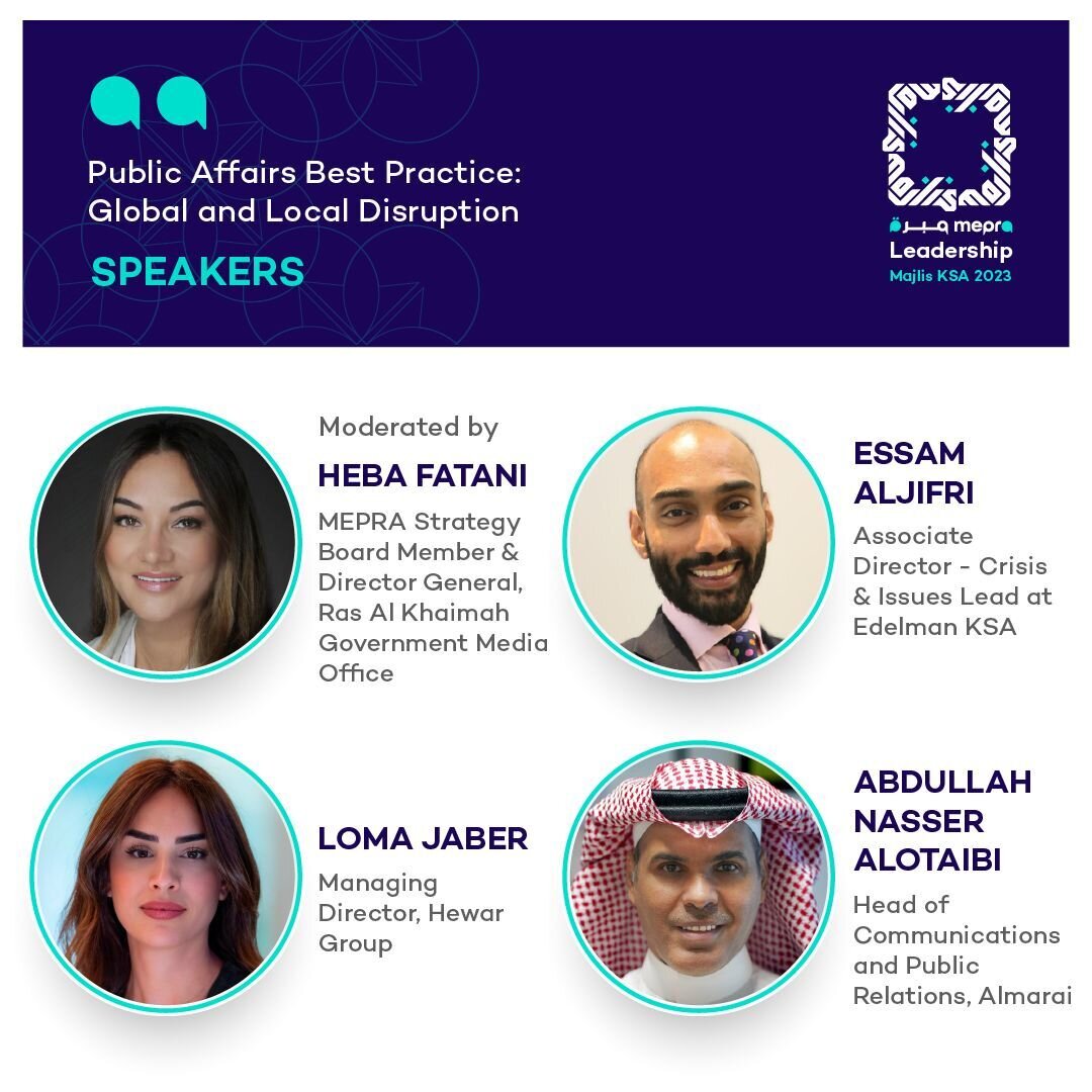 وتشارك في الجلسة الثانية من الحدث نخبة من المتحدثين من روّاد الأعمال لاستكشاف أفضل الممارسات المعتمدة على المستويين المحلي والعالمي للتغلب على التحديات التي يشهدها قطاع التواصل والعلاقات العامة سريع النمو.وتدير الجلسة هبة فطاني، عضو المجلس الاستراتيجي في جمعية الشرق الأوسط للعلاقات العامة "ميبرا"، والمدير العام للمكتب الإعلامي لحكومة رأس الخيمة. كما يشارك فيها كلّ من عصام آل جفري، مدير مساعد – مسؤول قسم إدارة الأزمات والقضايا في شركة إيدلمان السعودية ، ولوما جابر، مدير عام، مجموعة حوار،وعبدالله ناصر العتيبي، رئيس قسم الاتصال والعلاقات العامة، بشركة المراعي.ويشارك في بقية الجلسات عدد من الخبراء من بينهم :