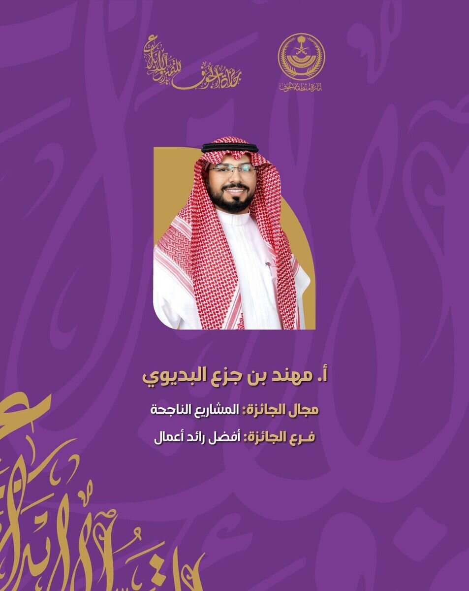 و حقق ضيفنا مهند بن جزع البديوي جائزة الجوف للتميز والإبداع كأفضل رائد أعمال في الجوف، وعن هذه الجائزة يقول: بداية أوجه التحية والشكر لسمو امير منطقة الجوف على الدعم الذي يقدمه والرعاية التي يوليها لنا كرواد اعمال ودورها في تحقيق النجاح. ويؤكد مهند ان جائزة الجوف لريادة الأعمال هي جائزة تقديرية تمنح من إمارة منطقة الجوف لتشجيع القطاع الحكومي ومؤسسات القطاع الخاص، وتكريم المتميزين بمنطقة الجوف وفقا لمعايير ذات جودة عالية تواكب رؤية المملكة 2030، وتحقق الريادة في التميز والإبداع، وتضم الجائزة 12 مجالاً، منها مجال ريادة الأعمال. ويضيف: بفضل من الله حققنا جائزة هذا العام من بين 400مرشح لنفس الفئة وحققنا الرقم القياس بأعلى نقاط وصلت لمائة بالمائة تقديراً لجهودنا ومسيرتنا المميزة.