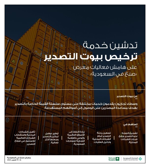 وأطلقت هيئة تنمية الصادرات السعودية على هامش أعمال المؤتمر المصاحب خدمة "ترخيص بيوت التصدير" التي تهدف إلى تشجيع التوجه نحو التصدير من خلال تأهيل الشركات المحلية واستقطاب الاستثمارات الأجنبية ورفع قدرات الشركات المحلية, مما يسهم بزيادة النفاذ إلى الأسواق العالمية والوعي بالعلامة التجارية للصادرات السعودية, إلى جانب تسهيل رحلة التصدير أمام الشركات المحلية وتذليل العقبات، وتوفير عوامل تمكين التصدير وجعلها أكثر فعالية.