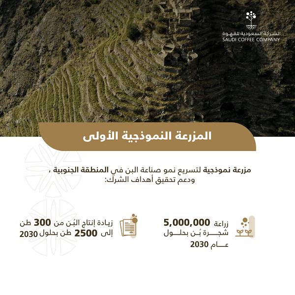 وتهدف الشركة السعودية للقهوة إلى زراعة 5 ملايين شجرة بن بحلول عام 2030. وستطبق المزرعة إجراءات تشغيل قياسية عالمية المستوى، بما يساعد في تعزيز جودة قهوة أرابيكا، القهوة الخاصة بالمملكة العربية السعودية. كما ستوفر المزرعة نموذجاً للاستخدام الأمثل للمياه في المنطقة، خاصةً عند انخفاض مستويات المياه خلال موسم الجفاف.