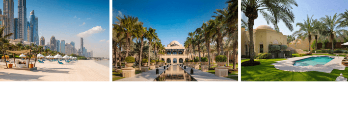 يتربّعُ ون آند أونلي رويال ميراج على امتداد كيلومتر من الشواطئ الخاصّة المطلّة على جزيرة النخلة، ويحتضن داخله حدائق خضراء وارفة، وكأنّما هو واحة شاطئيّة مهيبة تعكس جمال وبهاء الأصالة العربية العريقة. ينقسم المنتجع لثلاث مناطق مختلفة يكمل كلّ منها الآخر: ذا بالاس وأربيان كورت وريزيدنس آند سبا، ويعكس كلّ منها التصميم البديع والتراث العريق وكرَم الضيافة الذين تمتاز بهم المنطقة العربيّة. كما يستحضر المنتجع الأساطير القديمة لهذه المنطقة العربيّة التي تعانق أفق المدينة الحديث الممتد على طول دبي مارينا، جامعاً بين التقليديّ والعصريّ بمنتهى الإنسيابية.