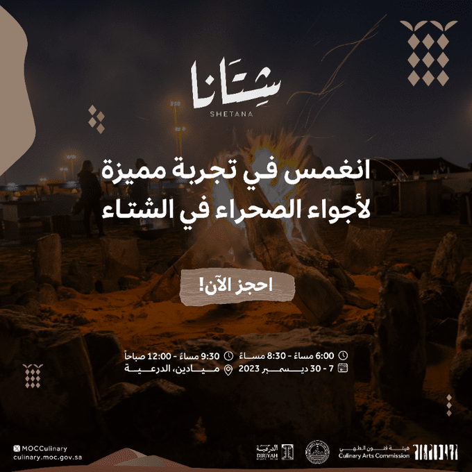 تنظم هيئة فنون الطهي فعالية "شتانا" خلال الفترة من 7 إلى 30 ديسمبر الجاري في "ميادين" بمحافظة الدرعية، بالتعاون مع هيئة تطوير بوابة الدرعية، ضمن موسم الدرعية؛ لتحتفي من خلاله بالتجارب التراثية في الصحراء، وتُسلّط الضوء على حسن الضيافة، وما يُميز المطبخ السعودي من وصفاتٍ غذائية تُعدُّ خصيصاً في فصل الشتاء، ولتُقدم تجربة ثقافية سعودية للمواطنين، والمقيمين، والسيّاح تسمح من خلالها بمعايشة الثقافة السعودية العريقة، وتجربة الأطعمة التقليدية في الصحراء بأسلوبٍ عصري، وتدعم المنتجين المحليين.