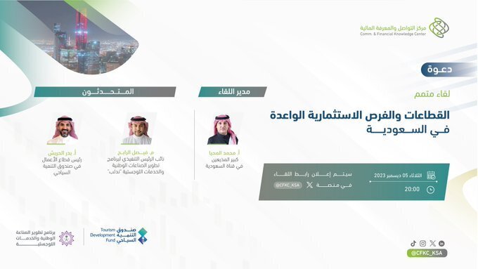 نظم مركز التواصل والمعرفة المالية "متمم" ، لقاءً بعنوان (القطاعات والفرص الاستثمارية الواعدة في المملكة)، بمشاركة كل من رئيس قطاع الإستراتيجية في صندوق التنمية السياحي المهندس بدر الحربش، ونائب الرئيس التنفيذي لبرنامج تطوير الصناعات الوطنية والخدمات اللوجستية (ندلب) المهندس فيصل الرابح، وأدار اللقاء الإعلامي محمد المحيا.