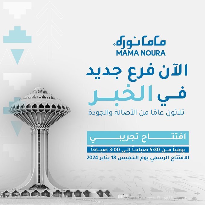 أعلنت "ماما نورة"، إحدى أشهر سلاسل مطاعم الوجبات السريعة في المملكة العربية السعودية عن قرب افتتاح فرعها الجديد في محافظة الخبر، ويقع الفرع الجديد على كورنيش الخبر في الواجهة البحرية ويعد الفرع التاسع لها في المملكة.وسيكون الافتتاح الرسمي غداً الخميس 18 يناير .
