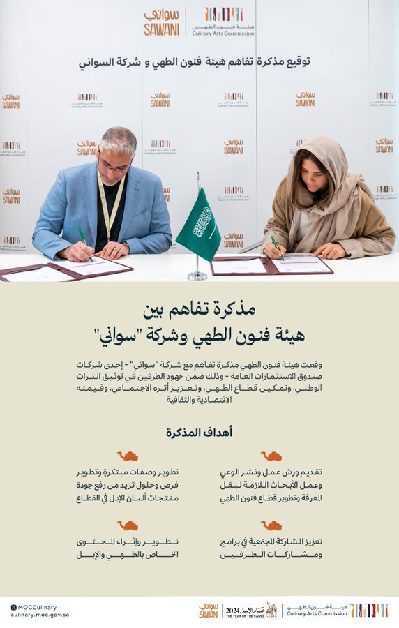 واشتملت المذكرة على تقديم ورش عملٍ، وحملاتٍ توعويةٍ، والأبحاث اللازمة لنقل المعرفة، وتطوير قطاع فنون الطهي المحلي، إلى جانب دعم استحداث وصفاتٍ مبتكرةٍ، وإطلاق فرصٍ وحلولٍ ترفع من جودة المنتجات الغذائية التي يوفرها قطاع حليب الإبل، وستعمل الهيئة والشركة وفقاً للمذكرة على تطوير كتاب عن الإبل، بحيث تُشارك "سواني" في تطوير المحتوى، وتوفير البيانات والمعلومات اللازمة، على أن تكون ملكية الحقوق الفكرية الخاصة بالكتاب للهيئة بشكلٍ كامل، وتدعم المذكرة تنظيم ومشاركة الطرفين في فعاليات فنون الطهي بالمملكة؛ وأبرزها: مهرجان الوليمة السنوي، وذلك من خلال ابتكار تجارب تحقق الإضافة، وإطلاق حملات توعوية، وبرامج تعريفية لرفع الوعي العام بالقيم التراثية، والوطنية وأنواع الأطباق الشعبية.
