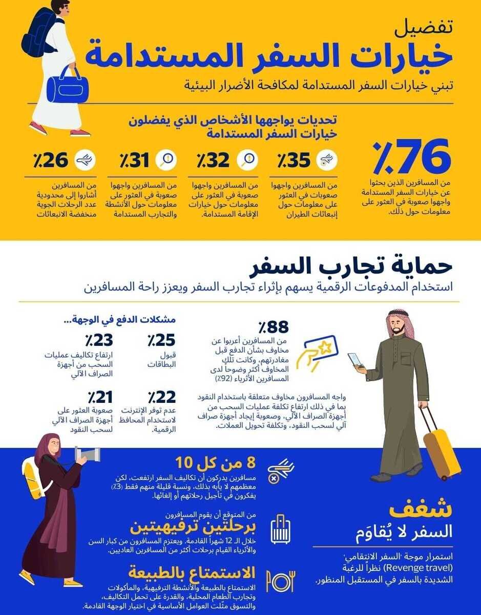 قال حوالي ثلاثة أرباع المسافرين السعوديين (72%) أنهم على دراية بتوفر خيارات السفر الصديقة للبيئة، وسعى نصفهم تقريباً (49%) إلى انتقاء خيارات سفر مستدامة خلال رحلتهم الأخيرة. وتأتي عروض الإقامة المستدامة (32%) ووسائل النقل الموفرة للطاقة (25%) في صدارة خيارات السفر المستدام. ومع ذلك، يجد معظم المسافرين (76%) صعوبة في الوصول إلى المعلومات المطلوبة بشأن خيارات السفر المستدامة. وقد يساهم تقديم المزيد من المعلومات حول السفر المستدام إلى زيادة الاهتمام بالخيارات المستدامة واعتمادها.