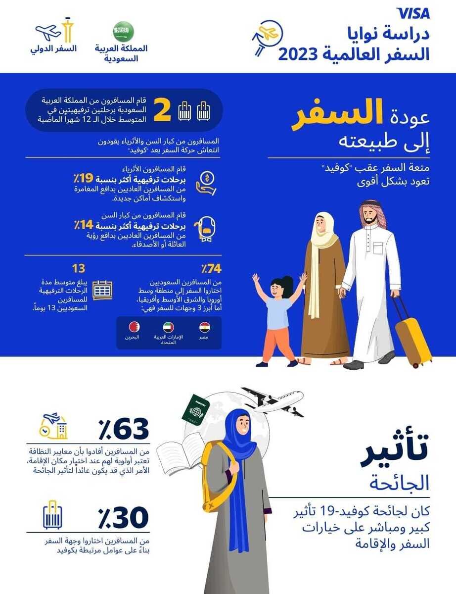أشارت دراسة نوايا السفر العالمية إلى تسجيل نمو كبير في أنشطة السفر دون أي مؤشرات على تباطؤه حتى في ظل ارتفاع التكاليف. ووفقاً لعينة المسافرين من المملكة العربية السعودية الذين شملهم الاستطلاع، تعد مصر والإمارات العربية المتحدة والبحرين أبرز وجهات السفر خلال الـ 12 شهراً الماضية. ومع أن 8 من أصل 10 مسافرين من المملكة أشاروا إلى ارتفاع تكاليف السفر، إلا أن 3% منهم فقط فكروا في تأجيل رحلاتهم أو إلغائها مما يؤكد استمرار الإقبال على السفر. وكشف الاستطلاع أن المسافرين من المملكة قاموا بحوالي رحلتين دوليتين في المتوسط لمدة 13 يوماً تقريباً خلال الـ 12شهراً الماضية. وركز 54% من المسافرين على السفر بدافع الاسترخاء والاستجمام في المقام الأول، يليه دافع التسوق (36%)، ومن ثم مقابلة العائلة والأصدقاء (35%)، واستكشاف مكان جديد (25%)، والبحث عن مغامرات جديدة (26%).