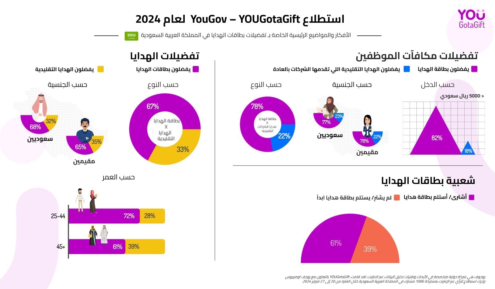 أفادت دراسة حديثة أن ما يقارب سبعة من كل عشرة (68%) مواطنين سعوديين يفضلون تلقي بطاقات الهدايا على الهدايا التقليدية، فيما يعد نتيجة مهمة ذات تأثير كبير على أصحاب العمل والعلامات التجارية على حد سواء، وذلك في استطلاع أجرته شركة "يو جوف" YouGov عبر الإنترنت، وهي مجموعة دولية متخصصة في تكنولوجيا البيانات والتحليلات البحثية، بالتعاون مع شركة "يو جوت أجيفت" YOUGotaGift، الرائدة في مجال بطاقات الهدايا الرقمية في الشرق الأوسط وشمال أفريقيا، وشمل الاستطلاع رأي أكثر من 1000 مشارك في السعودية.