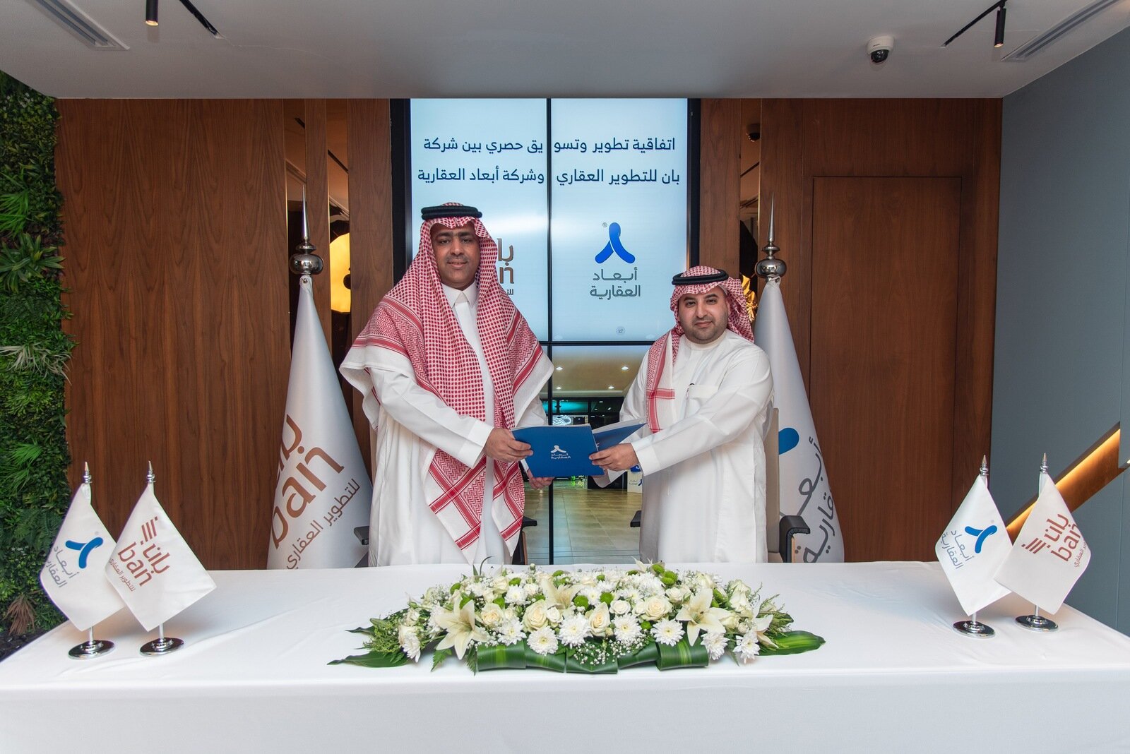 ووقع الشراكة الاستراتيجية رئيس مجلس إدارة شركة بان للتطوير العقاري الدكتور سعود المرزوقي والرئيس التنفيذي لشركة أبعاد للتسويق العقاري الأستاذ تركي القحطاني.