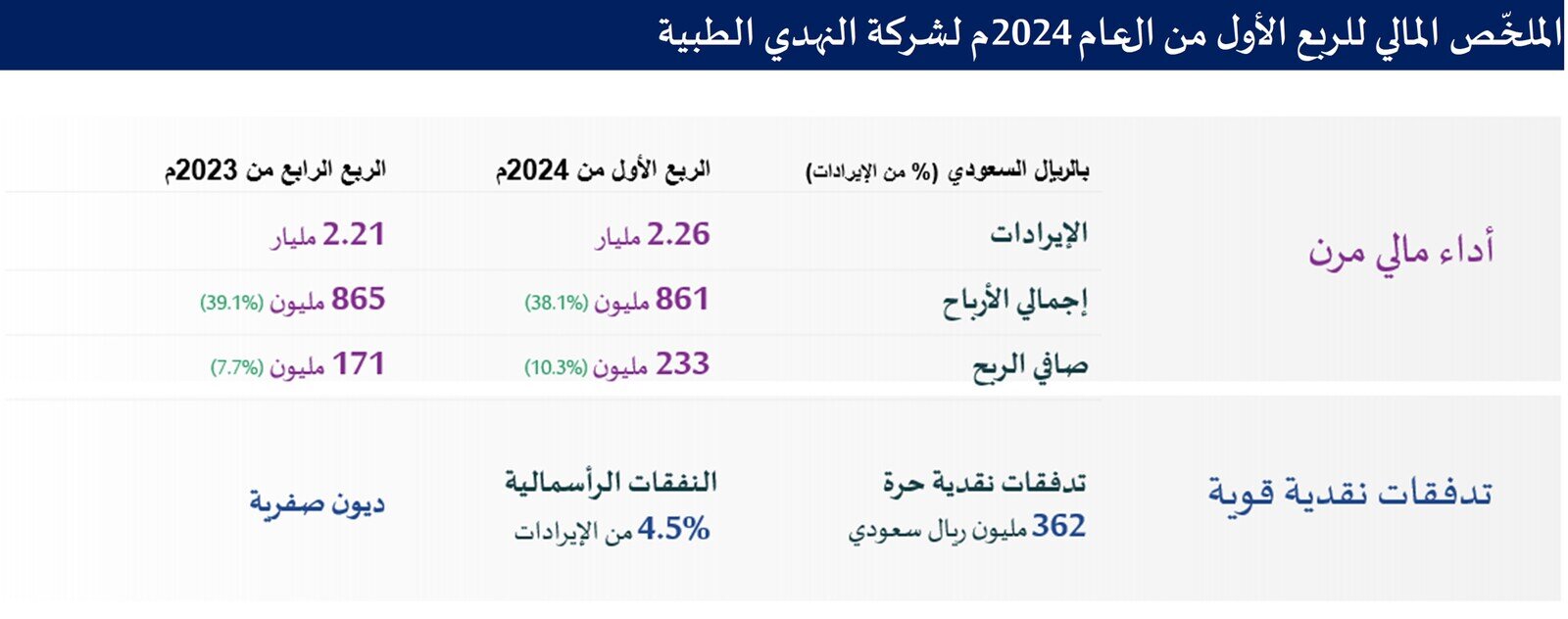 أعلنت شركة النهدي الطبية ("النهدي" أو "الشركة")، شركة رائدة في مجال الرعاية الصحية في المملكة العربية السعودية، اليوم عن نتائجها المالية للربع الأول من العام 2024م.