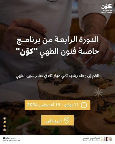 أعلنت هيئة فنون الطهي عن استعدادها لتنظيم الدورة الرابعة من برنامج حاضنة فنون الطهي "كوّن" خلال الفترة من 11 يونيو إلى 15 أغسطس؛ لتنمية القدرات في مجال الطهي عبر برامج متكاملة تُقدّم الدعم للطهاة المبتكرين والموهوبين، وروّاد الأعمال الممارسين في قطاع المأكولات والمشروبات، داعية الراغبين بالمشاركة إلى زيارة الموقع الإلكتروني للحاضنة عبر الرابط: https://engage.moc.gov.sa/kawn/.