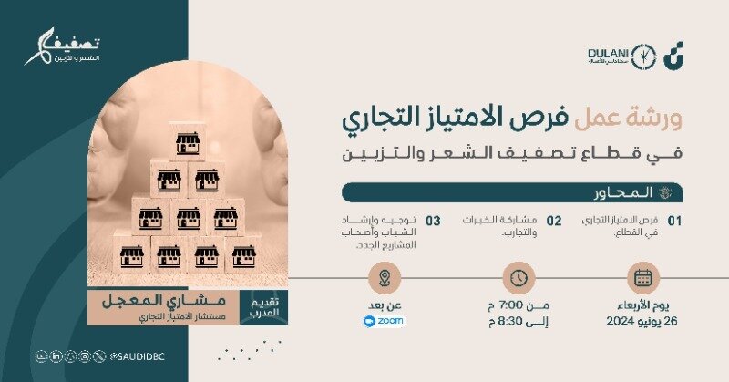 يقيم مركز دلني للأعمال ورشة متخصصة عن فرص الامتياز التجاري في قطاع الشعر والتزيين، وذلك يوم الاربعاء26يوينو بين الساعة 7- مساء .