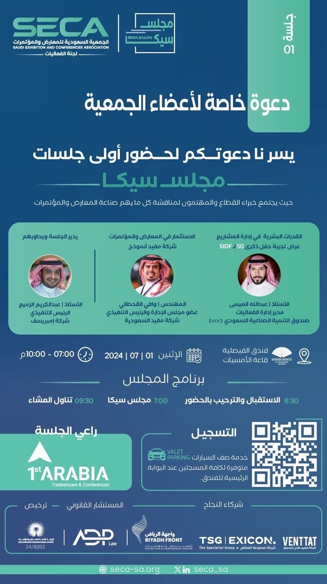 دعت الجمعية السعودية للمعارض والمؤتمرات أعضاء الجمعية لحضور أولى جلسات مبادرة "مجلس سيكا" والتي ستُعقد في تاريخ 1/7/2024 في فندق الفيصلية قاعة الأمسيات.