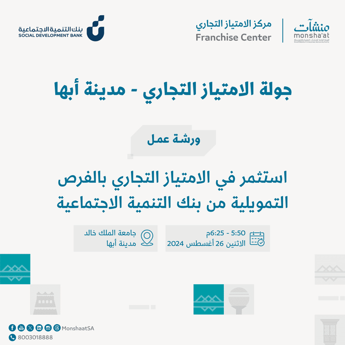 شارك بنك التنمية الاجتماعية في جولة الامتياز التجاري التي نظمتها الهيئة العامة للمنشآت الصغيرة والمتوسطة "منشآت" في مركز المعارض والمؤتمرات بجامعة الملك خالد بمدينة أبها بهدف نشر ثقافة الامتياز التجاري و تطوير ودعم القطاع بالإضافة إلى تأهيل العلامات الوطنية.