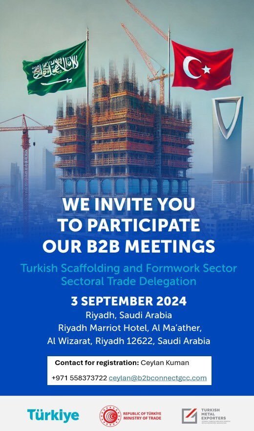 و يقام اللقاء في فندق ماريوت الرياض- المعذر يوم 3سبتمبر بتنظيم من جمعية إسطنبول لمصدري المعادن والفلزات وبدعم من وزارة التجارة التركية ،ويمكن معرفة المزيد من المعلومات والتسجيل للحضور من خلال التواصل مع سيلان كومان على الايميلceylan@b2bconnectgcc.com