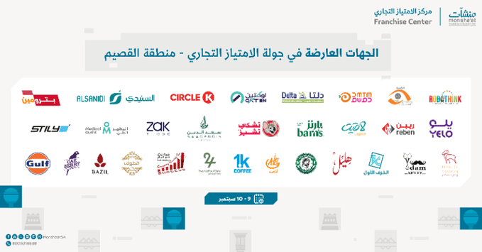 تنظم الهيئة العامة للمنشآت الصغيرة والمتوسطة "منشآت" جولة الامتياز التجاري في محطتها الثالثة بمنطقة القصيم خلال الفترة من 9 وحتى 10 سبتمبر؛ بهدف التعريف بالخدمات والبرامج في مجال الامتياز التجاري، بما يحقق مستهدفات رؤية المملكة 2030، وذلك في مركز الملك خالد الحضاري بمدينة بريدة.