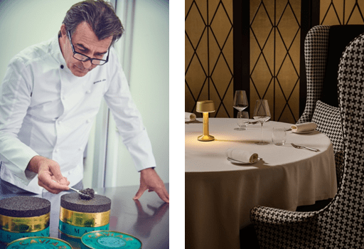 سيتمتّع الضيوف بتجربة طعام خارجة عن المألوف في صالة الطعام الفاخرة المُصمّمة بلونٍ واحد، حيث سيستهلّون وجبتهم مع الآيس كريم بنكهة الخرشوف مع كافيار برونييه المُقدّم مع جيلي الصنوبر وزيت البندق، يليه طبق كونسوميه آلان شابيل الذي يُقدّم مع كافيار برونييه، رقائق مقرمشة ودقيق الحنطة السوداء. تتسم الجدران الخشبية العالية بتصميم مسرحي وديكور داخلي يطغى عليه اللونان البرونزي والفضي، ما يمنحه طابعاً فاخراً وراقياً يتناغم مع الأطباق التي سيقدّمها الشيف، بما في ذلك تارت لانغوستين مع كافيار برونييه وصلصة الزبدة البيضاء بالزنجبيل، سمك القاروص بادابوم مع كافيار برونييه، يُقدم مع مرق الفطر وكريمة إيسيني، والخبز الحلو بلحم العجل المقرمش مع كافيار برونييه يُقدّم مع جبنة بوراتا والتوابل. وتُختتم التجربة بلمسة حلوة مع حلوى الميرينغ بالإجاص التي تُقدّم مع سوربيه اللوز وسوتيرن، وتارت الشوكولاتة المُقدّمة مع الكافيار والغاناش.