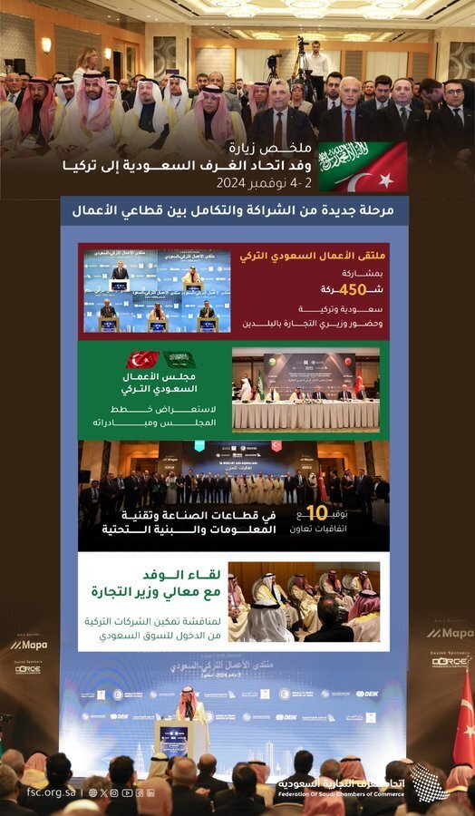 يذكر أن حجم التبادل التجاري بين المملكة وتركيا بلغ 25.4 مليار ريال عام 2023 محققًا نموًا بنسبة 15.5 %، تمثل الصادرات السعودية لتركيا منها 15.6 مليار ريال، أما الواردات التركية للمملكة فتمثل 9.8 مليارات ريال.