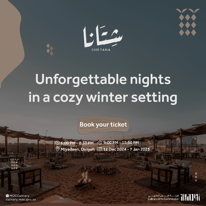 وتتضمن الفعالية فترتين رئيسيتين: الفترة الأولى من 6:00 مساءً وحتى 8:30 مساءً، والفترة الثانية من 9:00 مساءً وحتى 11:30 مساءً، سيتمكن الزوار خلالها من الاستمتاع بمجموعة متنوعة من الأنشطة والفعاليات الشتوية التي تسلّط الضوء على فنون الطهي السعودية، والتجارب الثقافية الساحرة.