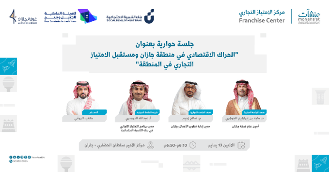 تنظّم الهيئة العامة للمنشآت الصغيرة والمتوسطة "منشآت"، خامس جولات الامتياز التجاري في منطقة جازان خلال الفترة من 13 وحتى 14 يناير، بشراكة مع وزارة التجارة وبرنامج التحول الوطني، وبنك التنمية الاجتماعية، والمركز السعودي للأعمال، وبنك المنشآت الصغيرة والمتوسطة، والهيئة الملكية للجبيل وينبع، وأمانة منطقة جازان، وغرفة جازان، إلى جانب مشاركة عددٍ من الجهات الداعمة والممكنة؛ ومجموعة من أصحاب العلامات التجارية المانحة للامتياز التجاري والجهات ذات العلاقة في منظومة الامتياز التجاري.