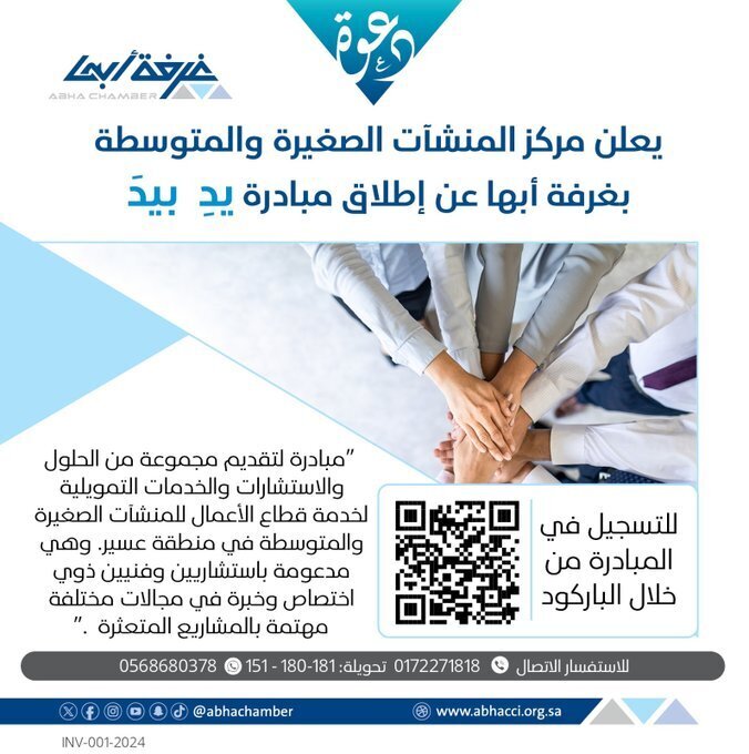 أطلقت الغرفة التجارية الصناعية في أبها ممثلة في مركز المنشآت الصغيرة والمتوسطة مبادرة "يدًا بيد " التي تهدف إلى تقديم مجموعة متنوعة من الخدمات لتلبية احتياجات الكيانات الاقتصادية المهمة .
