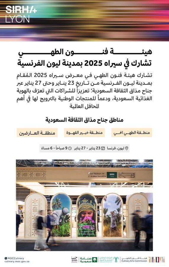 تُشارك هيئة فنون الطهي في معرض "سيراه 2025"، الذي يُقام بمدينة ليون الفرنسية خلال الفترة من 23 إلى 27 يناير الجاري، حيث تعرض الهيئة من خلال جناحها "مذاق الثقافة السعودية" تجربةً ثقافية متميزة تُبرز فنون الطهي السعودية وتنوّعها.