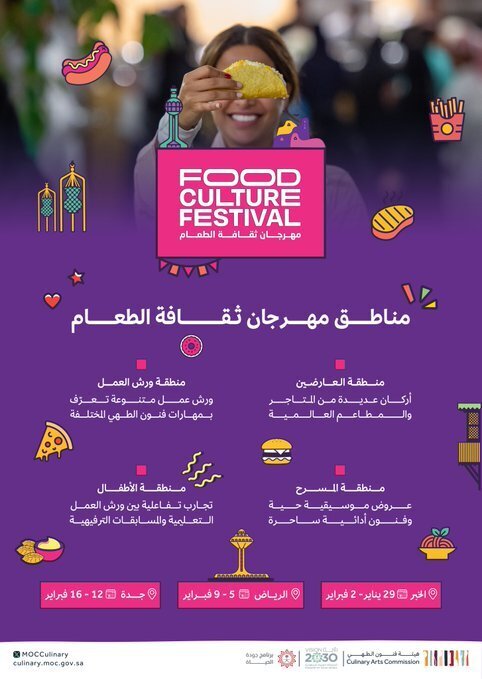 تنظم هيئة فنون الطهي عن تنظيم "مهرجان ثقافة الطعام" لعام 2025، بدعم من برنامج جودة الحياة في ثلاثة مواقع مختلفة في الخُبر، الرياض، وجدة، حيث سيُقام المهرجان في الخُبر خلال الفترة من 29 يناير إلى 2 فبراير، وفي الرياض من 5 إلى 9 فبراير، بينما سيختتم فعالياته في جدة من 12 إلى 16 فبراير؛ احتفاءً بثقافات فنون الطهي المحلية والعالمية.