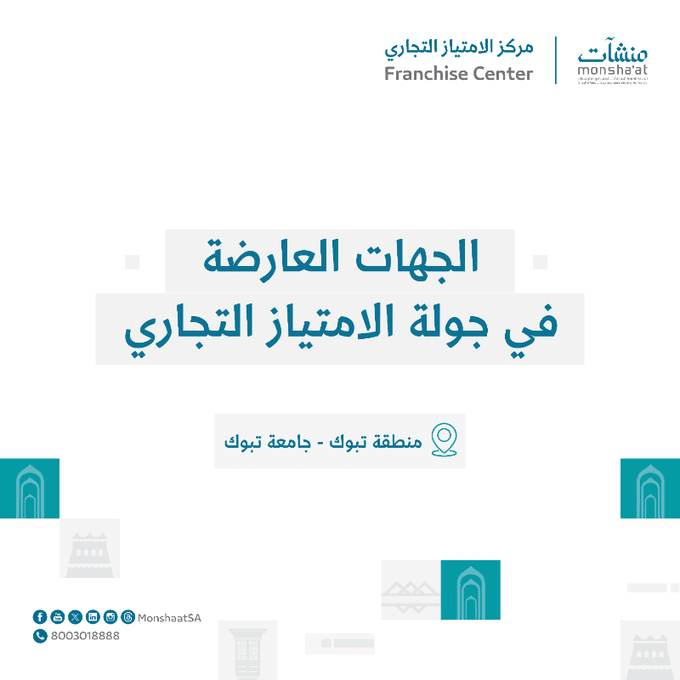ويمكن للمهتمين التسجيل لحضور الجولة عبر الرابط: https://franchisesa.monshaat.gov.sa؛ وذلك للتعرُّف على برنامج الجولة والاستفادة من الخدمات المقدَّمة خلالها.