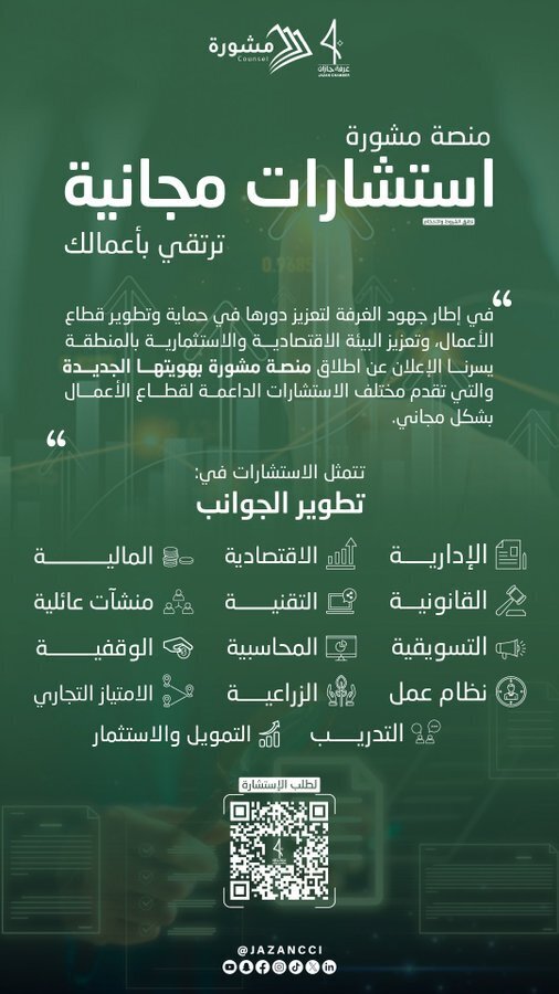 أطلقت غرفة جازان منصة "مشورة" بهويتها الجديدة؛ التي تهدف إلى تعزيز بيئة الأعمال والاستثمار في المنطقة من خلال تقديم استشارات مجانية؛ لدعم قطاع الأعمال بمختلف مجالاته.