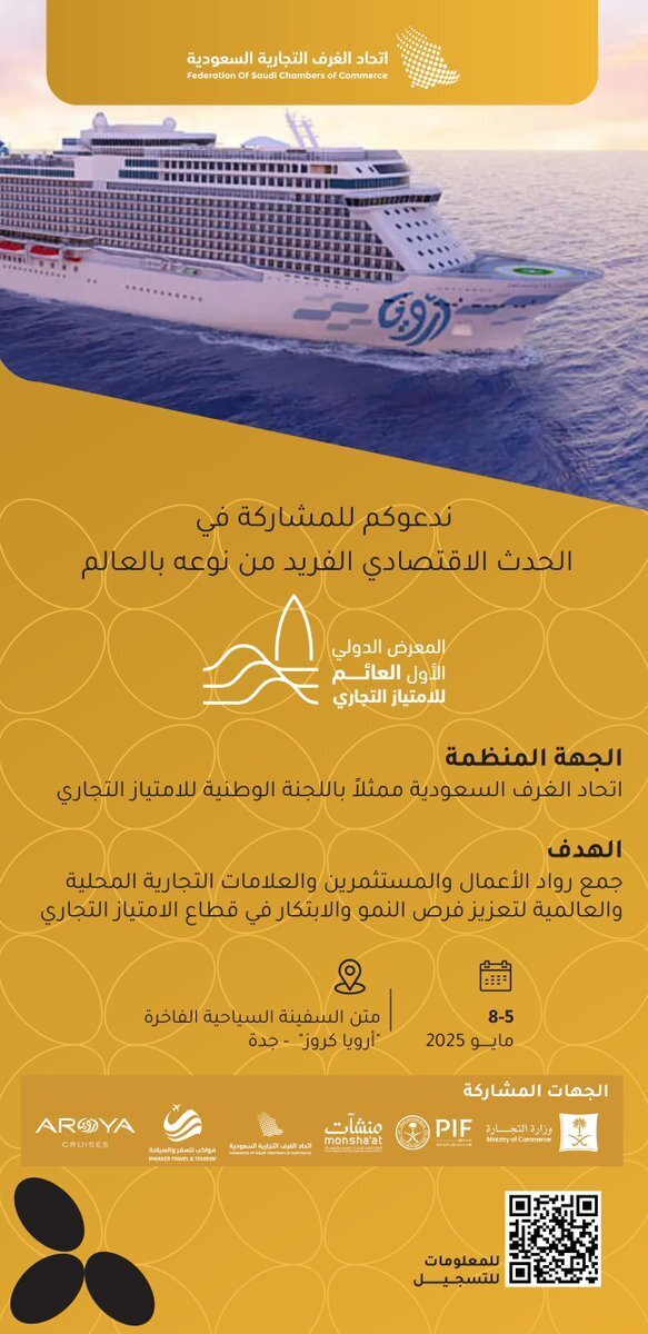 أعلن اتحاد الغرف السعودية ممثلًا باللجنة الوطنية للامتياز التجاري عن عزمه تنظيم المعرض الدولي الأول العائم للامتياز التجاري، خلال الفترة 5 - 8 مايو 2025 على متن أرويا كروز في مدينة جدة.