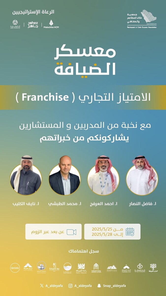 في خطوة رائدة نحو تعزيز قطاع المطاعم والمقاهي، تقيم جمعية ملاك المطاعم والمقاهي "معسكر الضيافة- الامتياز التجاري"، وهو برنامج تدريبي مكثف عبر الإنترنت يهدف إلى تمكين رواد الأعمال الطموحين وتحويل مشاريعهم إلى علامات تجارية ناجحة يمتد انتشارها في كل مكان.