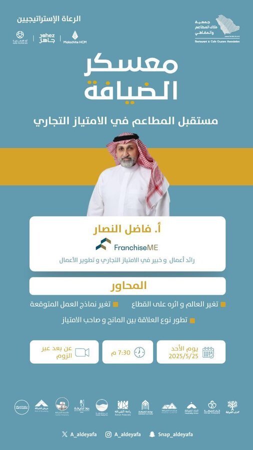 وكان الأستاذ فاضل النصار افتتح اليوم الأول من معسكر الضيافة بورشة عنوانها"مستقبل المطاعم في الامتياز التجاري" وكانت ورشة مهمة لكل من يسعى لفهم التغيرات القادمة في القطاع واستكشاف آفاق جديدة للنمو والتوسع.وتركزت المحاور على تغيّر العالم وأثره على قطاع المطاعم و تحوّل نماذج العمل المتوقعة و تطور العلاقة بين المانح وصاحب الامتياز.
